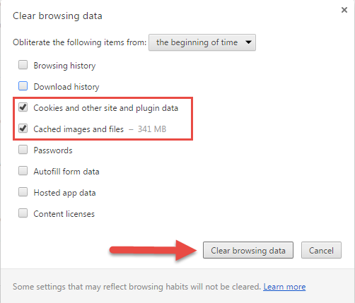 - In the box that appears, click the checkbxes for “Cookies and other site and plug in data” and “Cached images and files” .
