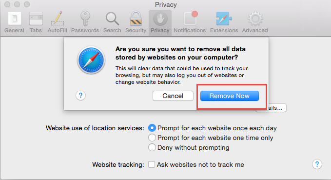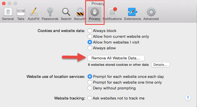 - In the window that appears, click Privacy tab. Click the button Remove All Website Data.